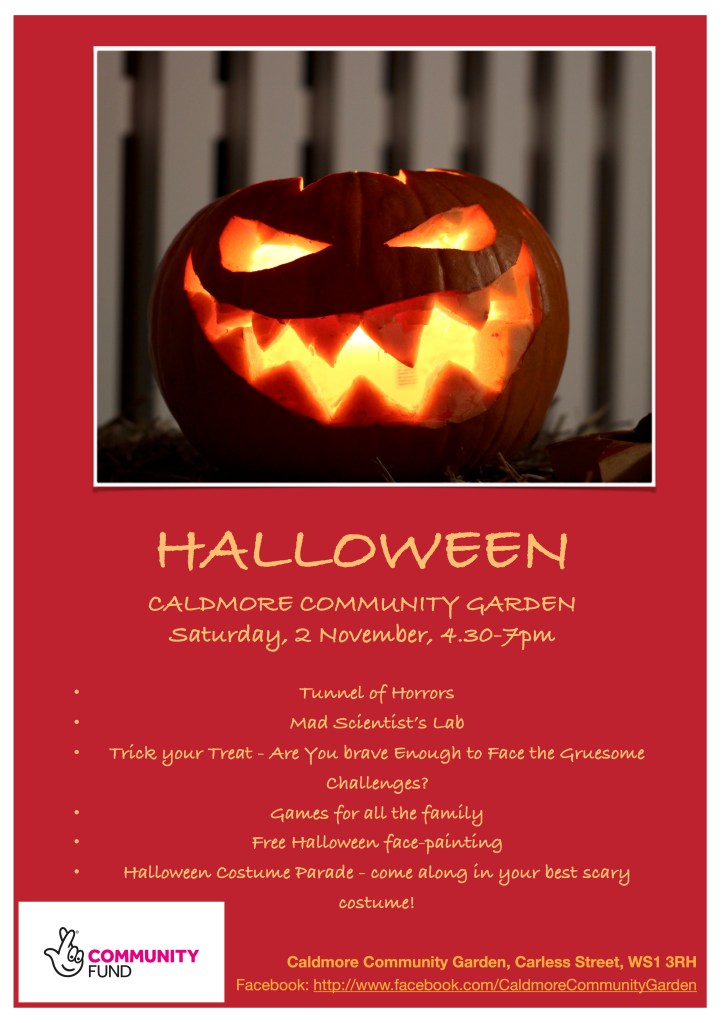 Halloween event – Saturday 2nd November 4.30pm October 23, 2019caldmorecommunitygarden Leave a comment Tunnel of HorrorsMad Scientist’s LabTrick your Treat – Are You brave Enough to Face the Gruesome Challenges?Games for all the familyFree Halloween face-paintingHalloween Costume Parade – come along in your best scary costume! Share this: Click to share on X (Opens in new window) X Click to share on Facebook (Opens in new window) Facebook Like Loading... Related