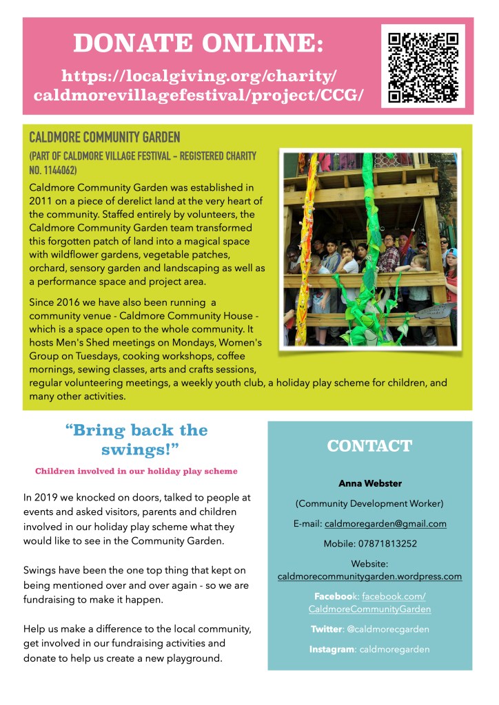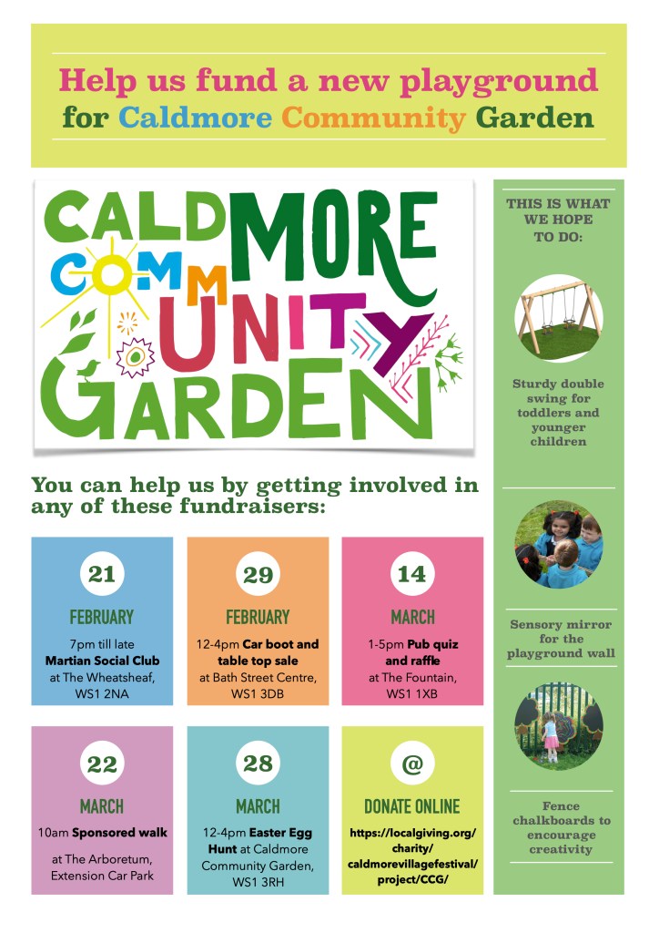 Donate online: https://localgiving.org/charity/caldmorevillagefestival/project/CCG/ (don’t forget to GiftAid it if you can – we are part of Caldmore Village Festival, registered charity no. 1144062).