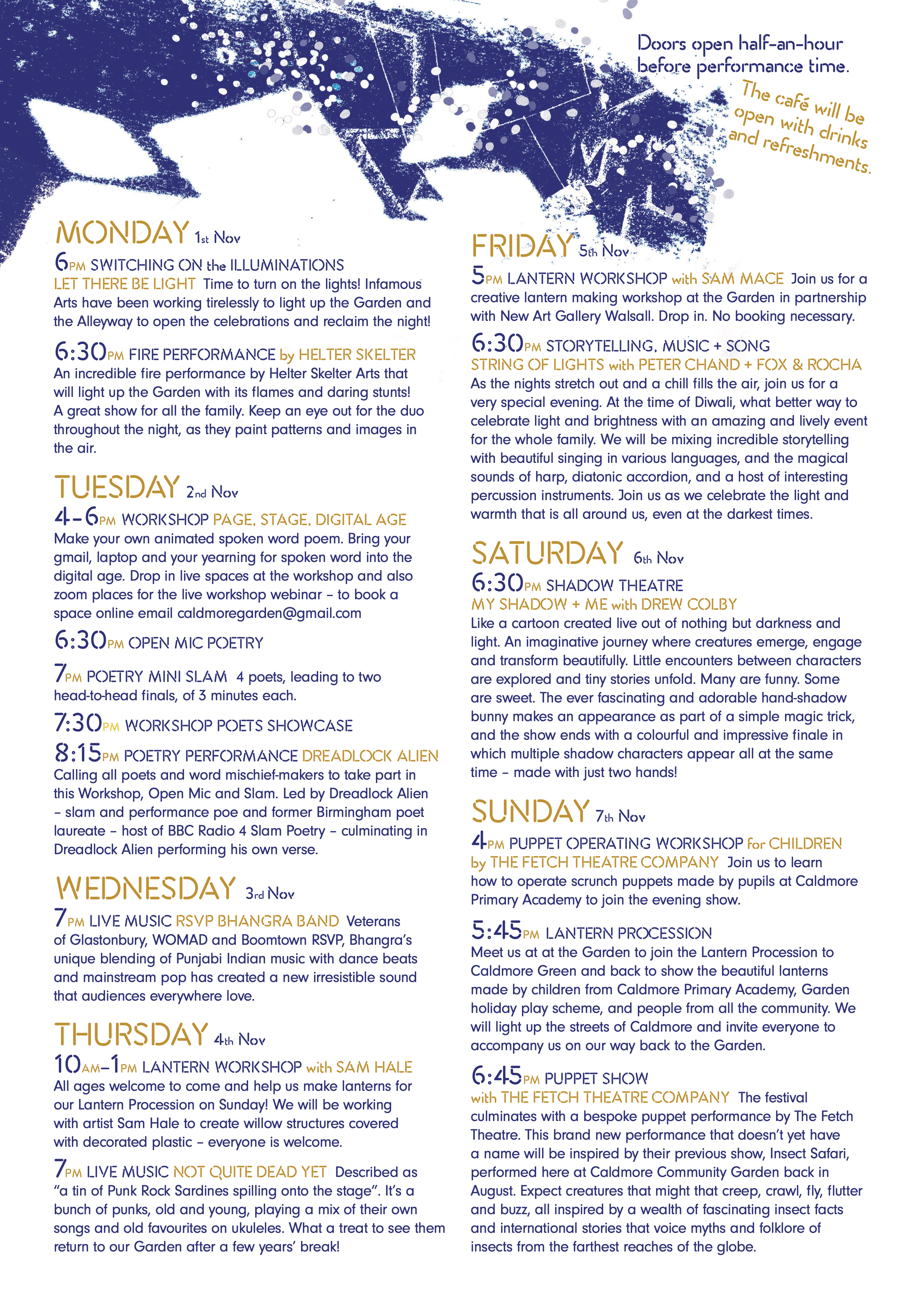 Meet us at 5:45pm at the Garden to join in with the Lantern Procession to Caldmore Green and back to show the beautiful lanterns made by children from Caldmore Primary Academy, Garden holiday play scheme, and people from all the community. We will light up the streets of Caldmore and invite everyone to accompany us on our way back to the Garden.