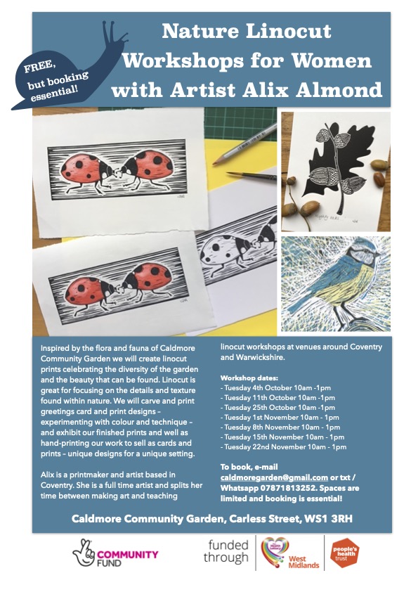 Inspired by the flora and fauna of Caldmore Community Garden we will create linocut prints celebrating the diversity of the garden and the beauty that can be found. Linocut is great for focusing on the details and texture found within nature. We will carve and print greetings card and print designs – experimenting with colour and technique – and exhibit our finished prints and well as hand-printing our work to sell as cards and prints – unique designs for a unique setting.