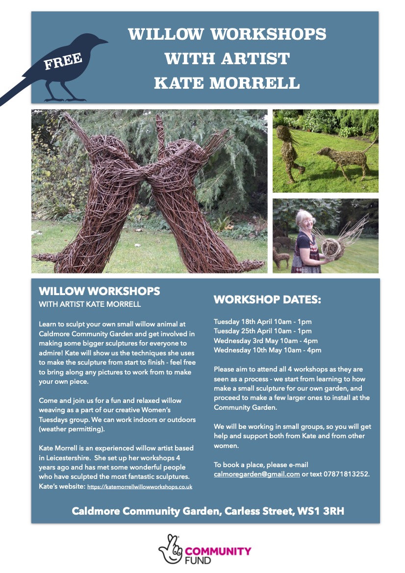 Learn to sculpt your own small willow animal at Caldmore Community Garden and get involved in making some bigger sculptures for everyone to admire! Kate will show us the techniques she uses to make the sculpture from start to finish – feel free to bring along any pictures to work from to make your own piece.