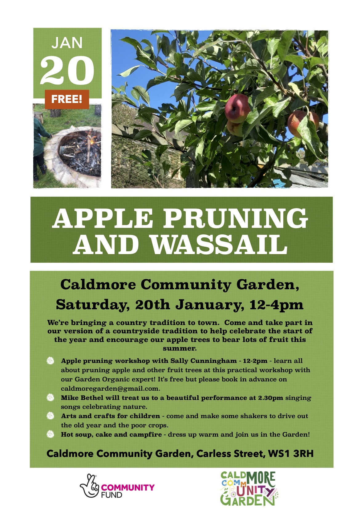- Apple pruning workshop with Sally Cunningham – 12-2pm – learn all about pruning apple and other fruit trees at this practical workshop with our Garden Organic expert! It’s free but please book in advance on caldmoregarden@gmail.com.