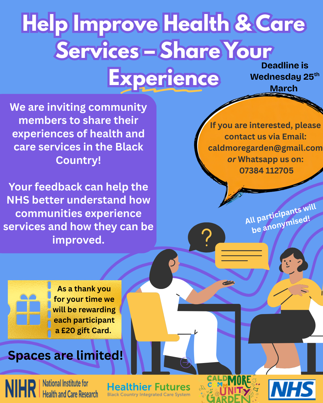 We are inviting community members to share their experiences of health and care services in the Black Country. Your feedback can help the NHS better understand how communities experience services and how they can be improved. This will be held at Caldmore Community Garden, where you can share you story with us.