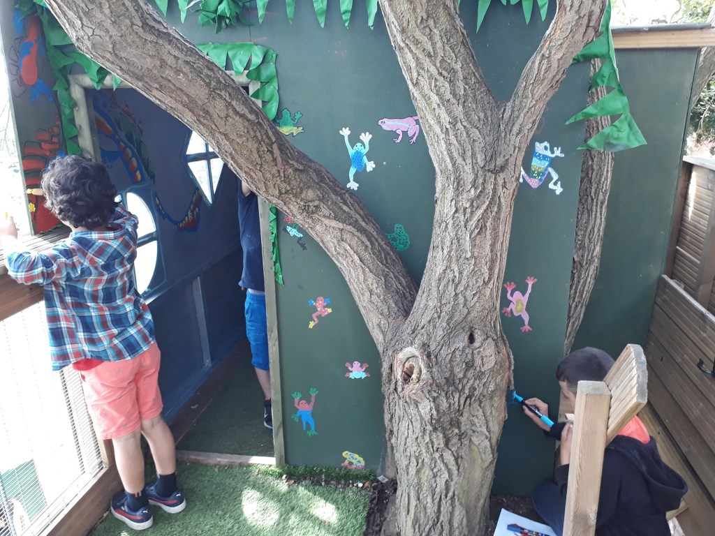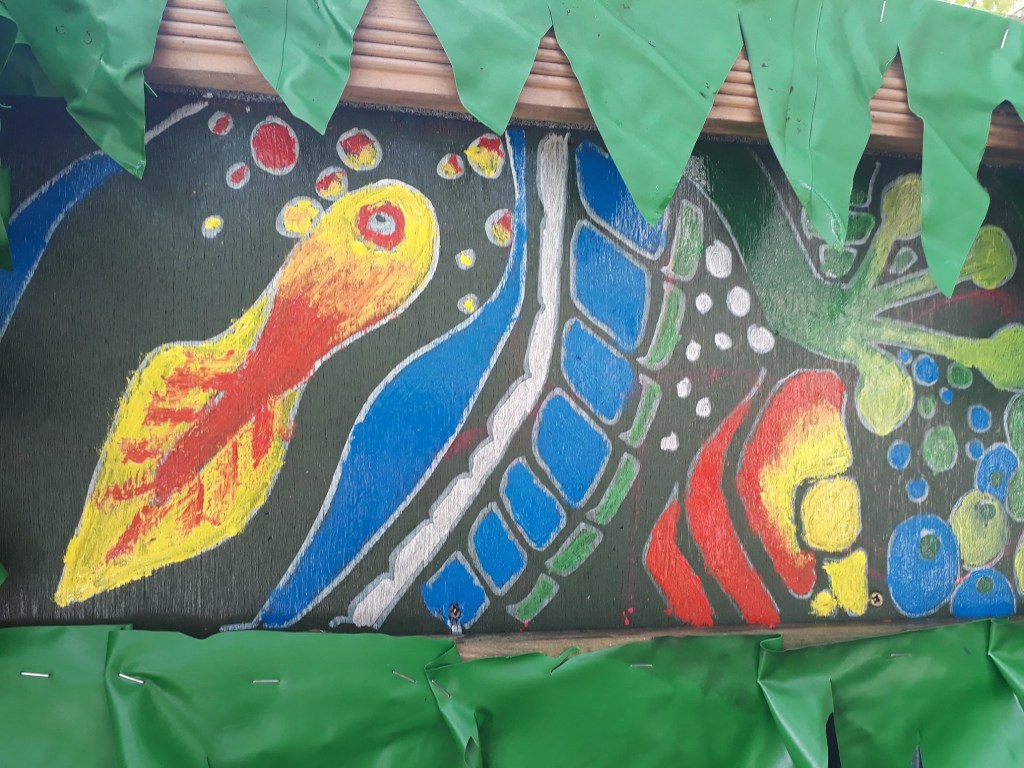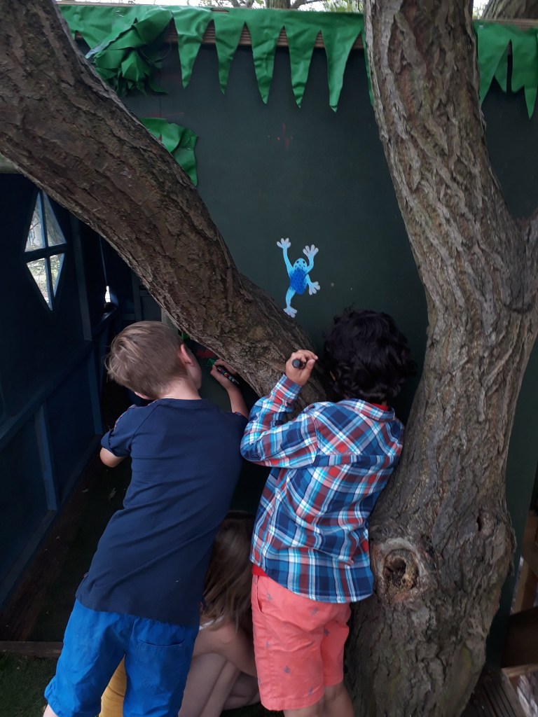 One of the projects that we were working on during our Summer Holiday Club was transforming the tree house. Children came up with two defined themes. They decided that the outside should look like a jungle and the inside should become a spaceship. We combined two themes and came up with the Tree Frogs’ Spaceship! A huge thank you to Maddy Smith , who was leading the project and to all the children, parents and volunteers that were involved in the work on the tree house.