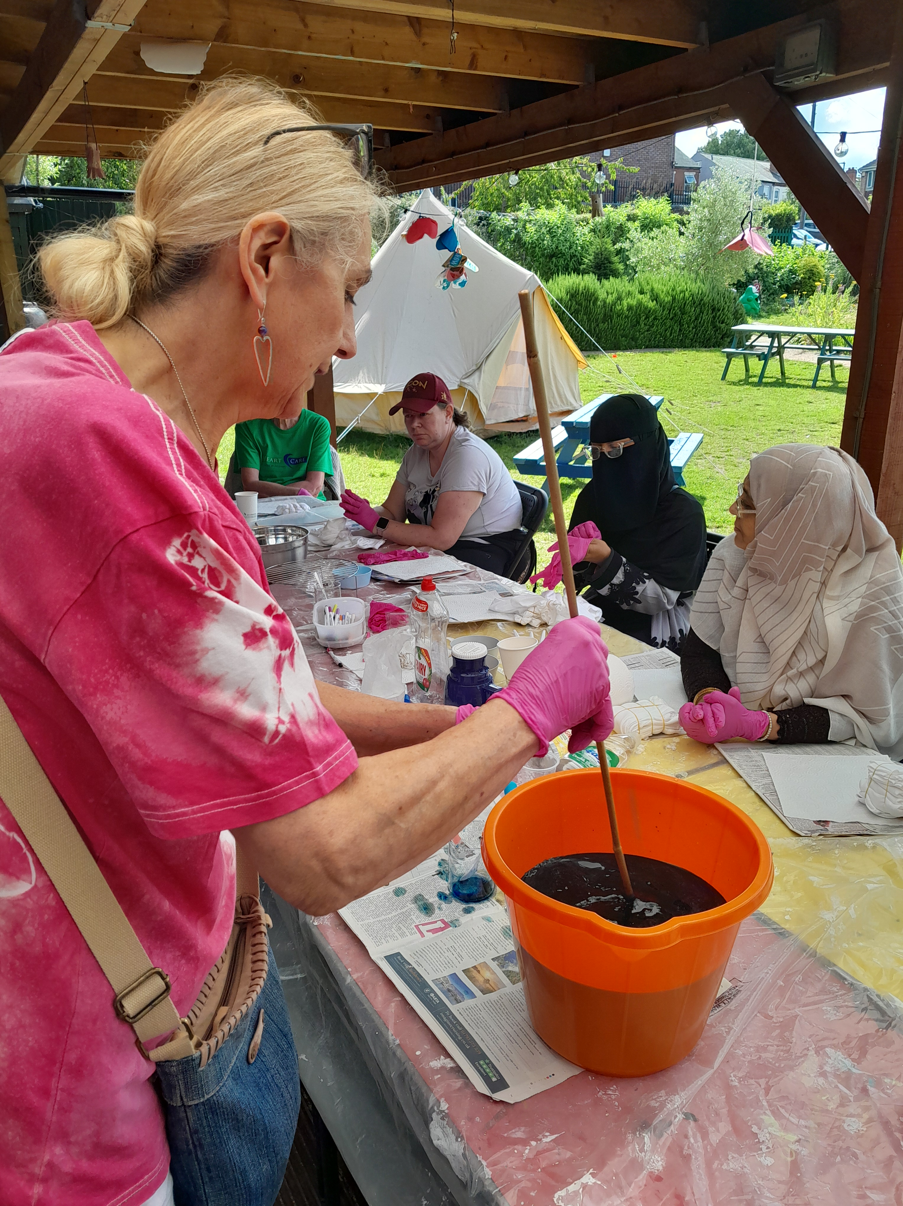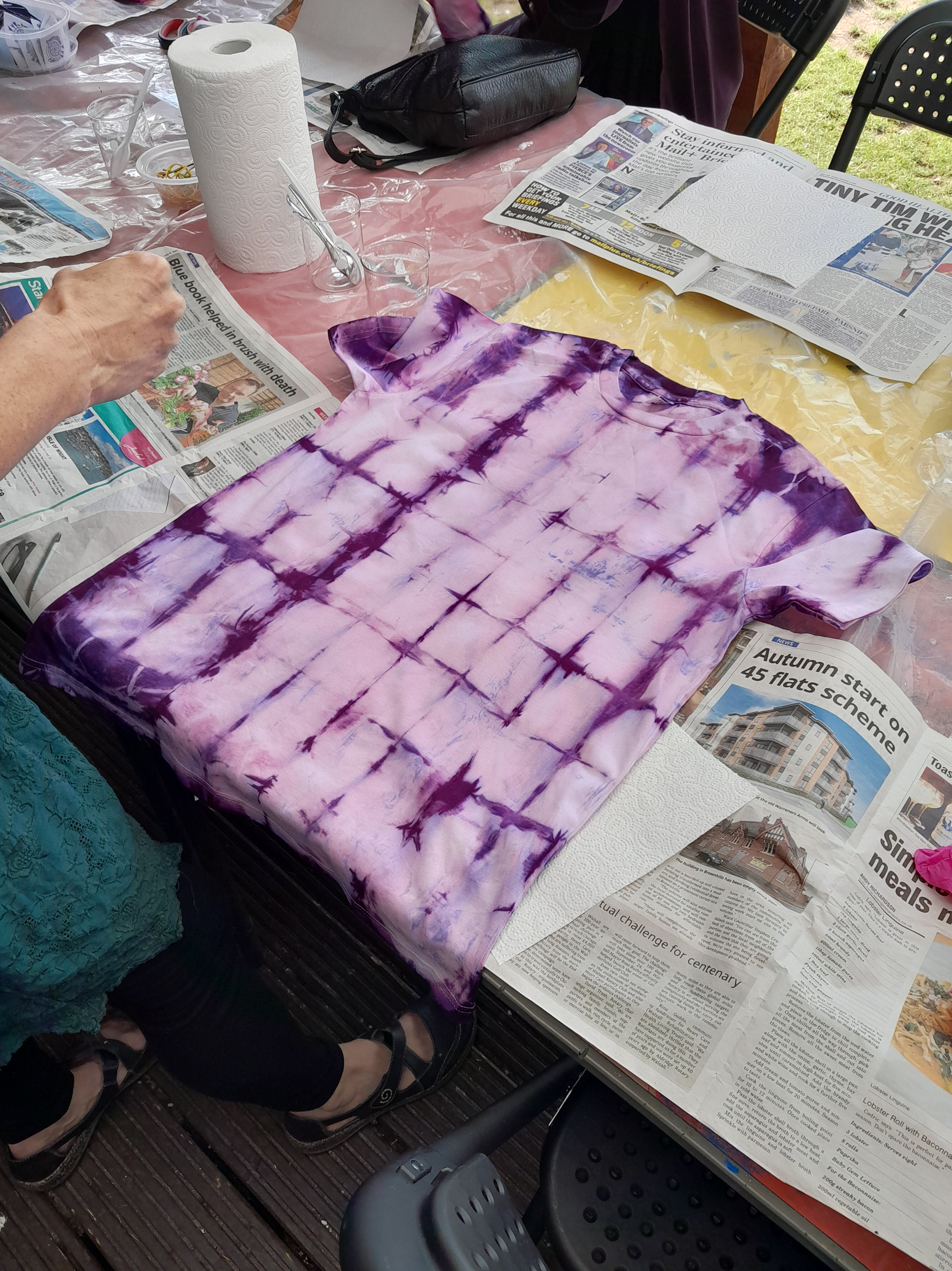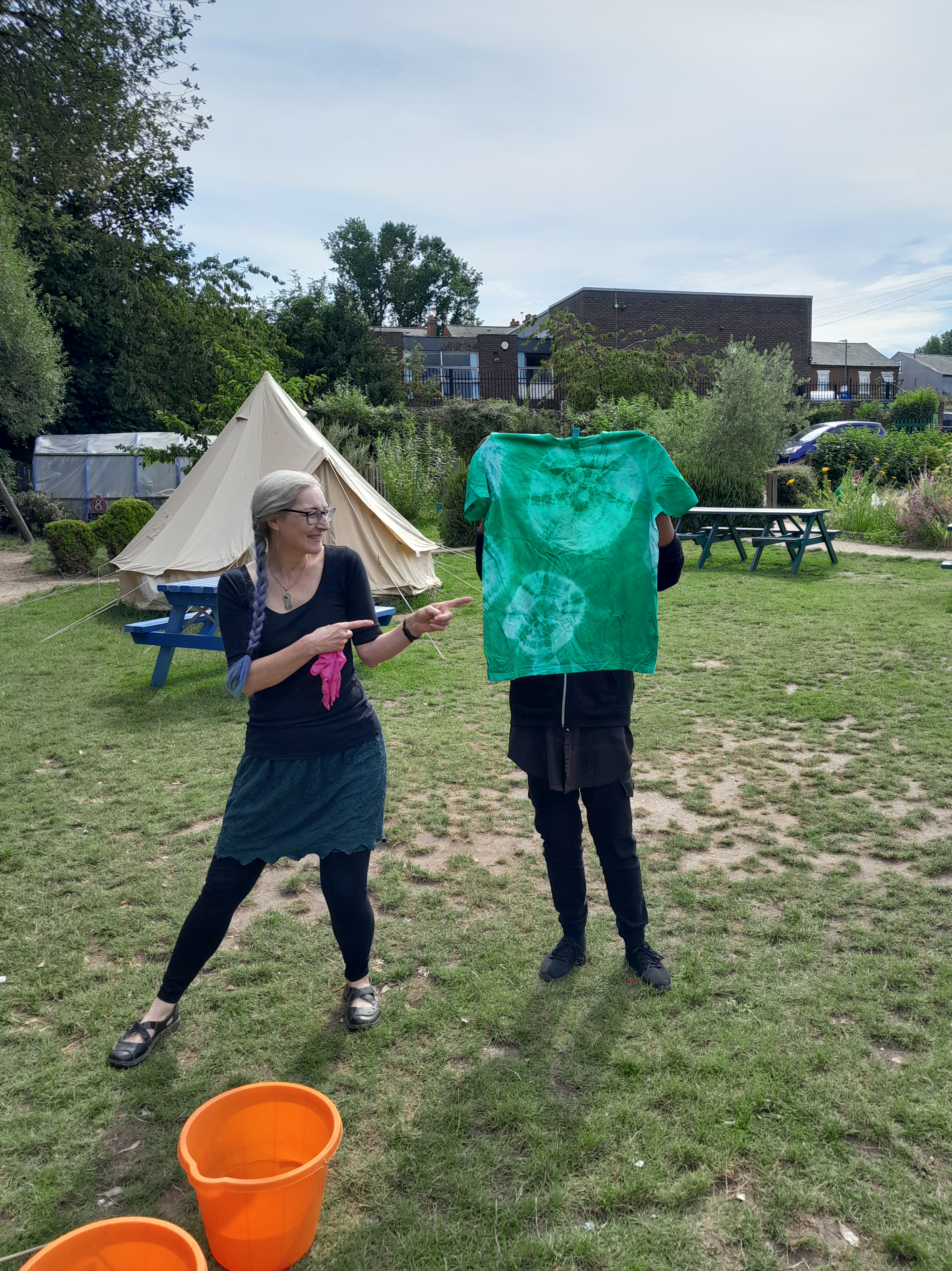 July was a busy and wonderful month! In the summer, we did wonderful designs for the tree house with macrame flowers. We did patchwork with Kate Tilley, who is a West Midlands-based artist before having two workshops with Jane Clarke to create some wonderful tie-dyed shirts.