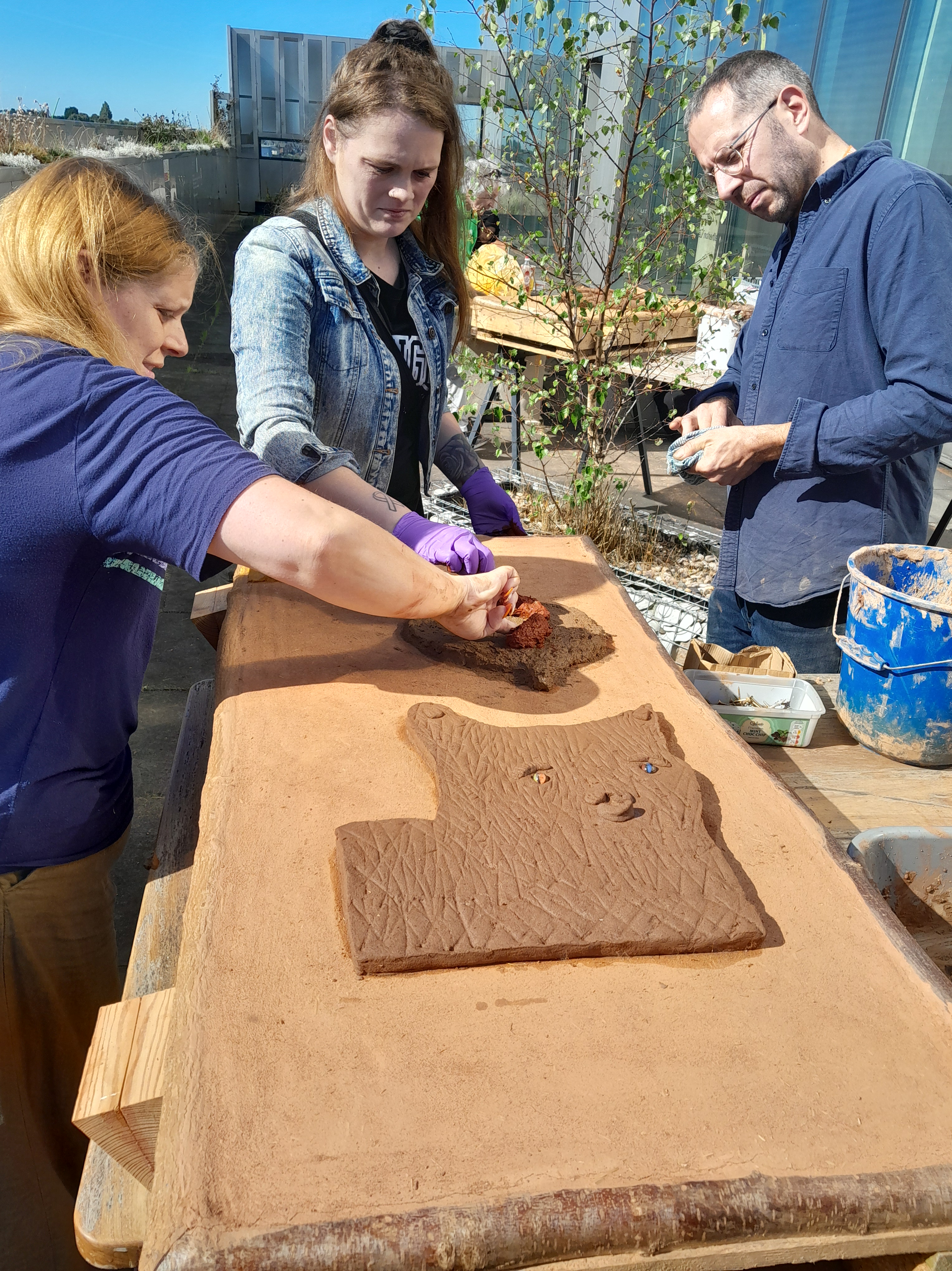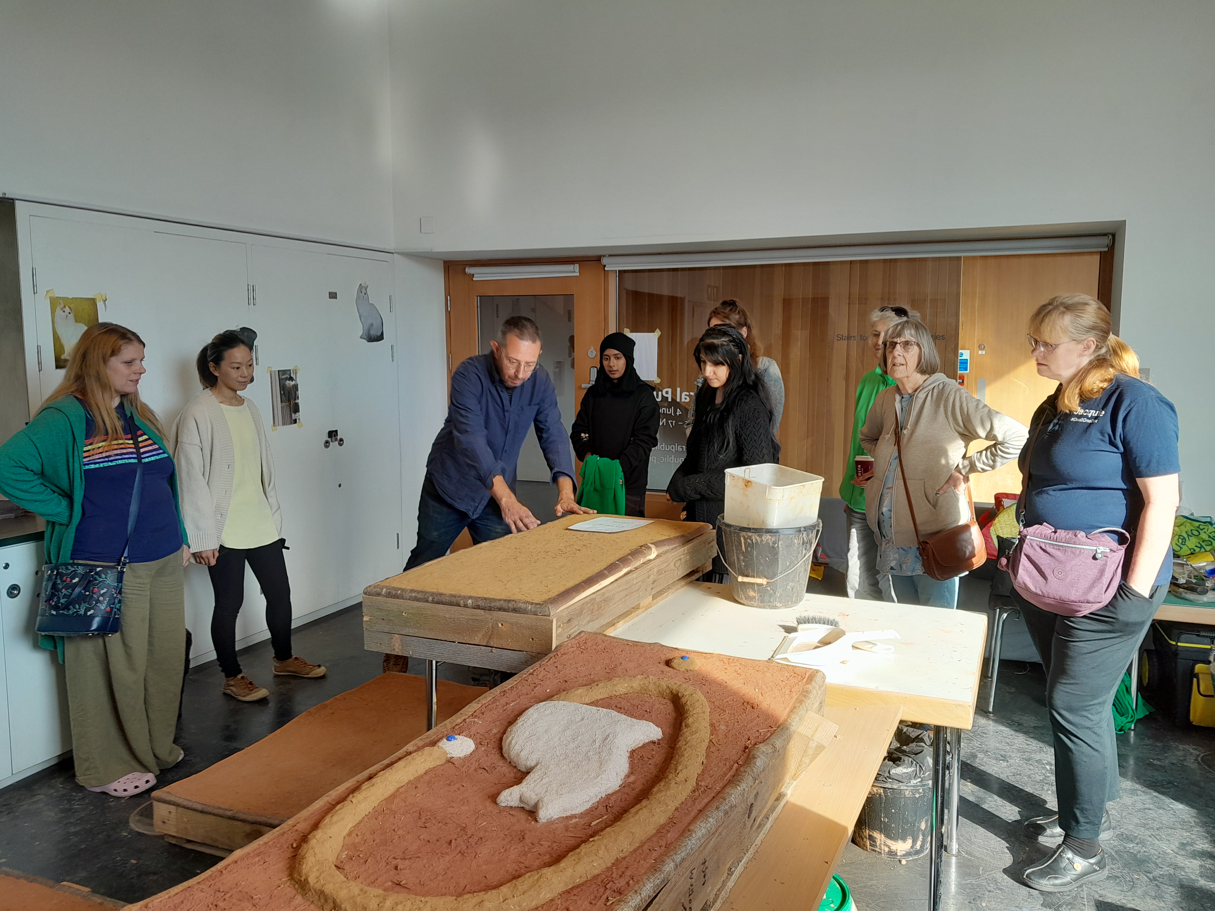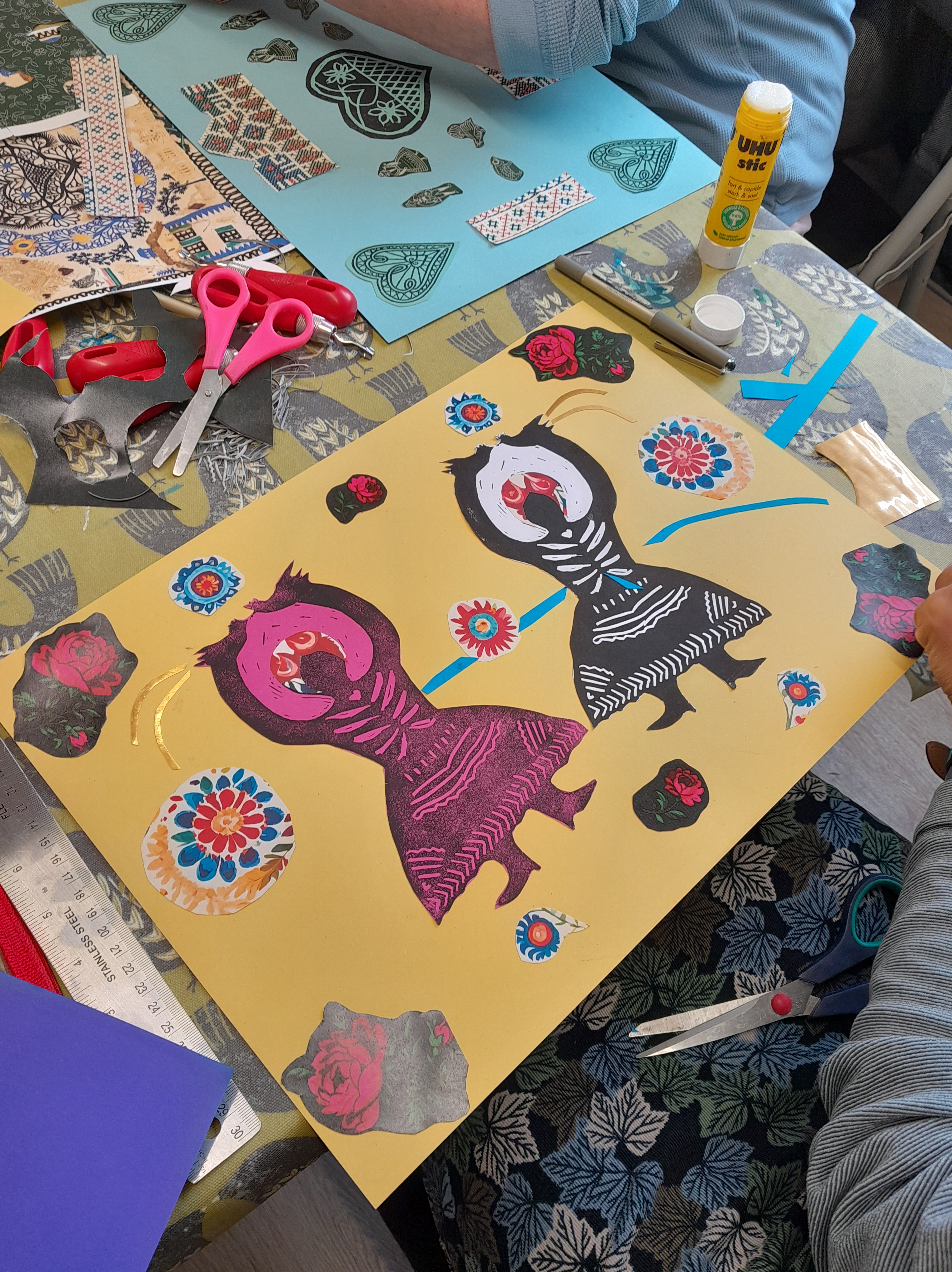 In September, we worked with the lovely Teresa Buskova in making our own artwork using paper collage with a combination of printmaking techniques including Lino printing. We then followed that workshop up with another, this time, to do some ceremonial bread baking, following a Czech recipe! We then followed this up with two sessions at the New Art Gallery in Walsall with Chris. ‘Mud Club’ was a wonderful pair of sessions where we built mobile animal sculptures from cob and other natural materials!