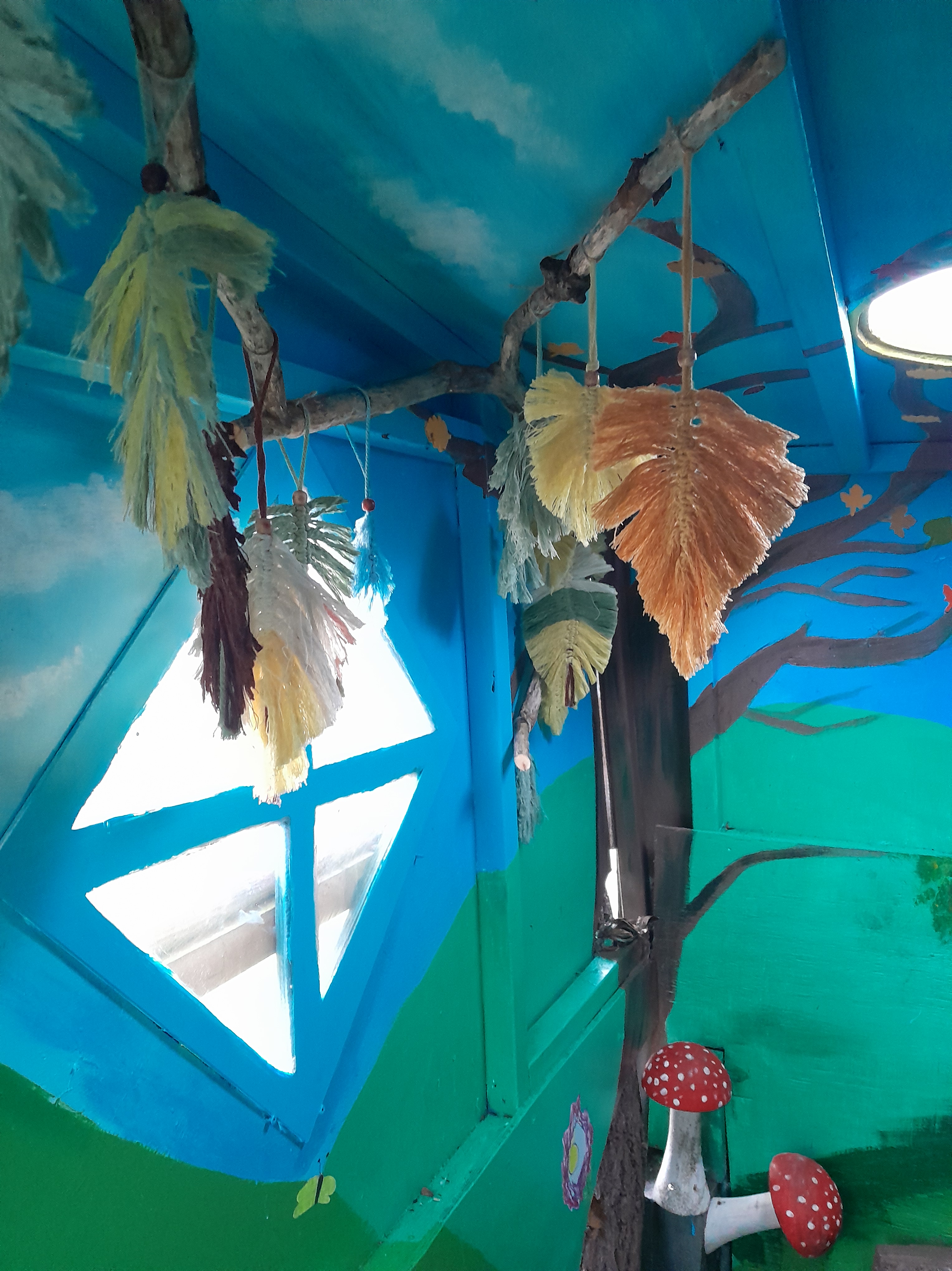 In June, we were joined by the lovely Ruth Radcliffe who led a couple of sessions to do some glass painting with our group. Later in the month, we were joined by Chris from General Public to introduce the group using cob as a creative medium, in preparation for an exciting collaboration with The New Art Gallery in Walsall. We were redecorating our treehouse, and created some macrame leaves and butterflies to hang from the ceiling!