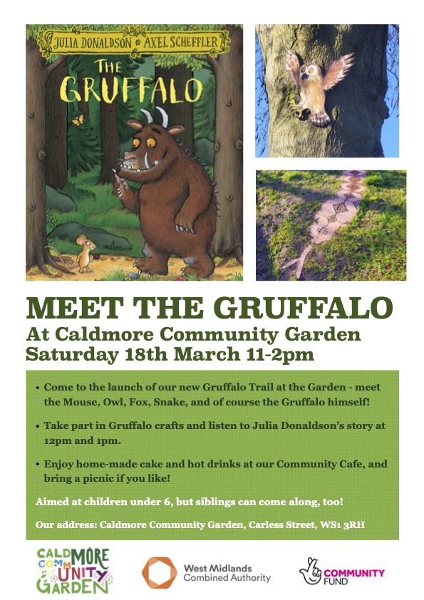 – Come to the launch of our new Gruffalo Trail at the Garden – meet the Mouse, Owl, Fox, Snake, and of course the Gruffalo himself! – Take part in Gruffalo crafts and listen to Julia Donaldson’s story at 12pm and 1pm. – Enjoy home-made cake and hot drinks at our Community Cafe, and bring a picnic if you like!